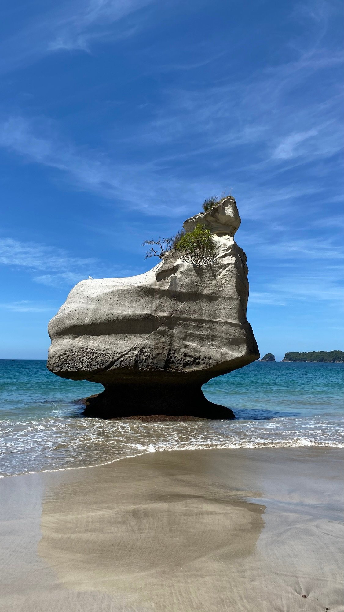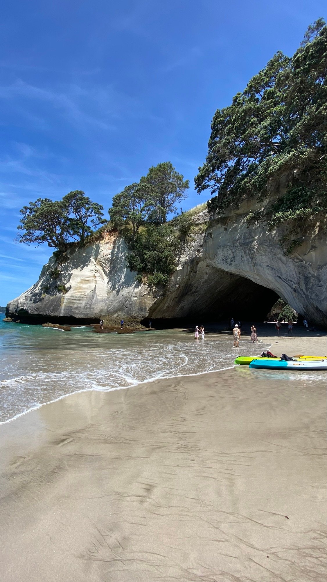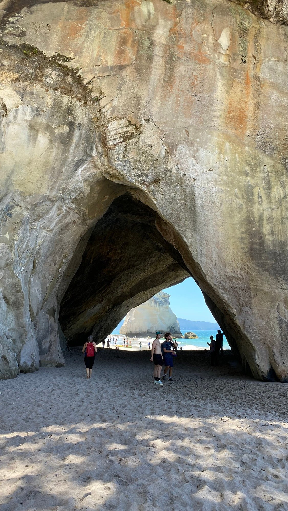 Nous finissons ensuite par atteindre la plage, heureusement à marée basse, ce qui nous permet de traverser sans problème la fameuse grotte naturelle reliant les deux parties de Cathedral Cove. L’endroit est tout simplement magique : falaises blanches sculptées par la mer, eau turquoise et sable doré. Nous profitons d’un moment de calme pour nous poser sur la seconde plage, baignés par le soleil.