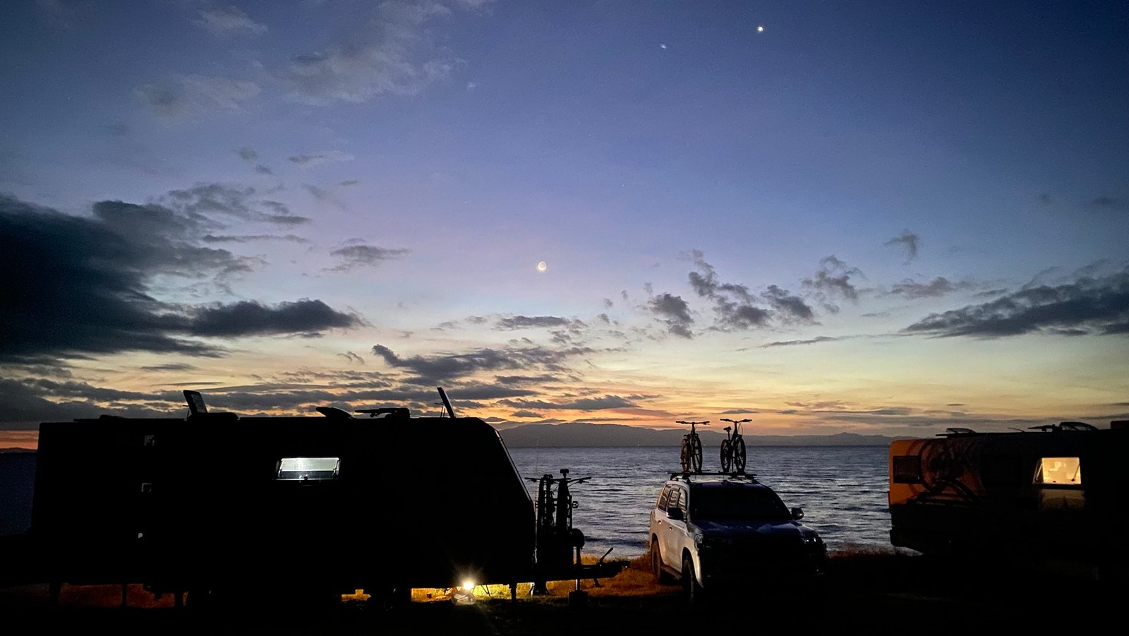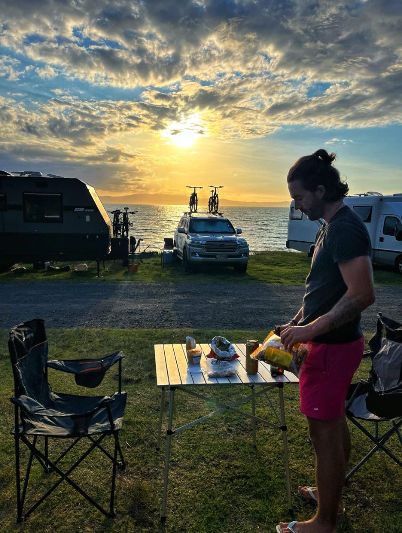 Finalement, nous décidons de changer nos plans et de traverser la péninsule via la Tapu Coroglen Road, une route sinueuse mais splendide, qui serpente au cœur de paysages montagneux verdoyants. Après plus d’une heure de route, nous atteignons la côte ouest et décidons de passer la nuit au Te Mata Point Reserve. Le spot est idéal : calme, face à l’eau, fréquenté par quelques locaux venus pêcher, et surtout… un coucher de soleil grandiose.